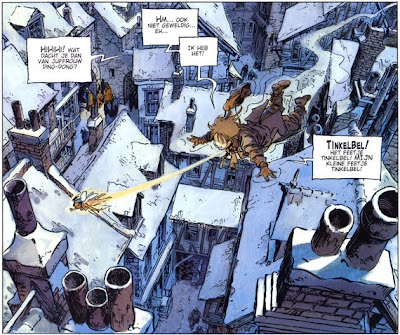 From Hell, 1988-1999) Alan Moore, en una obra enciclopédica (o ciclópea) de más de 500 páginas describe los asesinatos de las prostitutas en los muelles (en 1888) por el medico de la reina para salvar el honor de la corona (que más da matar negros, o indios que villanos o putas). Los dibujos de la historia de Moore son fríos, un mar de tintas oscuras en blanco y negro, pero Doisel utiliza la cámara de Charles Chaplin (la misma de Charles Dickens), para enseñarnos la inocencia en el fango y la dignidad del ser humano. Esto lo consigue mediante perfilados dibujos y al enfrentamiento de los sepias (color mierda) y los fríos azules de Londres con los brillantes colores primaverales del País de Nunca Jamás, llenos de romanticismo (en el sentido histórico estético del término) y alejados del expresionismo de